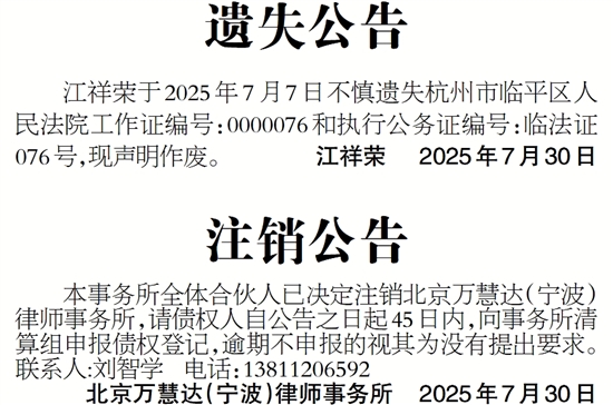 江祥荣于2025年7月7日不慎遗失杭州市临平区人民法院工作证编号:0000076和执行公务证编号:临法证076号,现声明作废。 江祥荣 2025年7月30日