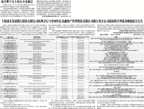 中国中信金融资产管理股份有限公司浙江省分公司作为上述债权的受让方,现公告要求公告清单中所列包括但不限于债务人、担保人及其清算业务人等其他相关当事人,从公告之日起立即向中国中信金融资产管理股份有限公司浙江省分公司履行主债权合同及担保合同约定的还本付息义务或相应的担保责任(若借款人、担保人因各种原因发生更名、改制、歇业、吊销营业执照或丧失民事主体资格等情形,请相关承债主体、清算主体代为履行义务或承担清算责任)。特此公告。 上海浦东发展银行股份有限公司杭州分行