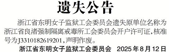 浙江省东明女子监狱工会委员会遗失原单位名称为浙江省良渚强制隔离戒毒所工会委员会开户许可证,核准号为J3310182619201,声明作废。