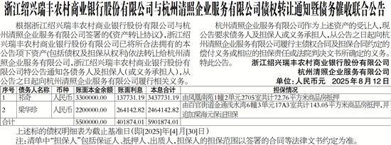 根据浙江绍兴瑞丰农村商业银行股份有限公司与杭州清照企业服务有限公司签署的《资产转让协议》,浙江绍兴瑞丰农村商业银行股份有限公司已将所合法拥有的本公告项下资产(包括债权及担保从权利)依法转让给杭州清照企业服务有限公司,浙江绍兴瑞丰农村商业银行股份有限公司特公告通知各债务人及担保人(或义务承担人),从公告之日起向杭州清照企业服务有限公司履行相关义务。