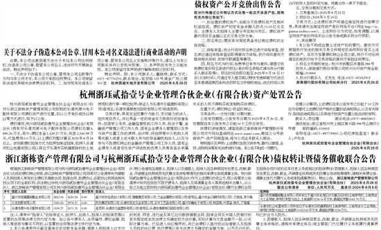 根据浙江浙栋资产管理有限公司与杭州浙珏贰拾壹号企业管理合伙企业(有限合伙)达成的债权转让安排,浙江浙栋资产管理有限公司将其对公告清单所列借款人及其担保人享有的主债权及借款合同、担保合同、抵债协议、还款协议和其他相关协议项下的全部权利,依法转让给杭州浙珏贰拾壹号企业管理合伙企业(有限合伙)。浙江浙栋资产管理有限公司及杭州浙珏贰拾壹号企业管理合伙企业(有限合伙)特公告通知各借款人、担保人以及借款人、担保人因各种原因发生更名、改制、歇业、吊销营业执照或丧失民事主体资格等情况的相关承债主体或清算主体。杭州浙珏贰拾壹号企业管理合伙企业(有限合伙)作为上述债权的受让方,现公告要求公告清单中所列包括但不限于债务人、担保人及其清算业务人等其他相关当事人,从公告之日起立即向杭州浙珏贰拾壹号企业管理合伙企业(有限合伙)履行主债权合同及担保合同约定的还本付息义务或相应的担保责任(若借款人、担保人因各种原因发生更名、改制、歇业、吊销营业执照或丧失民事主体资格等情形,请相关承债主体、清算主体代为履行义务或承担清算责任)。特此公告。 浙江浙栋资产管理有限公司