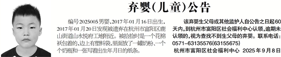 编号2025005男婴,2017年01月16日出生,2017年01月20日发现被遗弃在杭州市富阳区鹿山街道山水悦府工地附近。被拾捡时是一个花棉袄包着的,边上有塑料袋,里面放了一罐奶粉、一个个奶瓶和一张写着出生年月日的纸条。