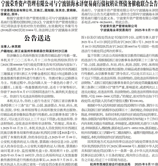 宁波荣升资产管理有限公司与宁波镇海永译贸易商行债权转让暨债务催收联合公告