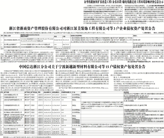 2、交易对象:具有完全民事行为能力、支付能力的法人、组织或自然人,并应具备一定的资金实力和良好的信誉条件,但国家公务员、金融监管机构工作人员、政法干警、金融资产管理公司工作人员、国有企业债务人管理层以及参与资产处置工作的律师、会计师、评估师等中介机构人员等关联人或者上述关联人参与的非金融机构法人,以及与参与不良债权转让的金融资产管理公司工作人员、国有企业债务人或者受托资产评估机构负责人员等有直系亲属关系的人员不得购买或变相购买该债权。 3、处置方式:组包、单户债权转让或收益权转让。 4、交易条件:一次性付款或分期付款。 5、公告有效期限:公告发布日期为2025年9月15日,有效期限自本公告发布之日起10个工作日有效。如需了解资产包内每户债权详细情况,请登陆浙江省浙商资产管理股份有限公司对外网站查询网址www.zsamc.com,微信公众号浙商资产-资产招商查询,或与公司业务联系人接洽。 6、特别提示及声明:以上信息仅供参考,最终以借据、合同、法院判决等有关法律资料为准,我公司不对其承担任何法律责任,我公司有权根据有关规定和要求对资产包内的债权及其处置方式、处置方案进行调整。本公告不构成一项要约。 7、受理公示事项:上述债权自本公告发布之日起10个工作日内受理对上述债权资产相关处置的征询和异议,以及有关排斥、阻挠征询或异议以及其他干扰资产处置公告活动的举报。 联系人:尤经理 联系电话:0571-81106826 通讯地址:浙江省杭州市上城区山南印中心2号楼101室 邮政编码:310000 举报电话:0571-89773995(公司纪律检查室) 联系人:卢先生