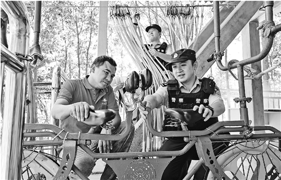 近日,三门县公安局横渡派出所组织民警深入辖区,开展安全检查,消除各类隐患,做好迎接国庆、中秋游客高峰的准备。图为民警在景区检查娱乐设施。