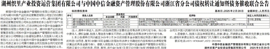 根据中国中信金融资产管理股份有限公司浙江省分公司与湖州织里产业投资运营集团有限公司签订的《债权转让协议》(编号为浙江Y11253141-3号),湖州织里产业投资运营集团有限公司所合法拥有的本公告项下资产(包括债权及担保从权利),已依法转让给中国中信金融资产管理股份有限公司浙江省分公司。湖州织里产业投资运营集团有限公司和中国中信金融资产管理股份有限公司浙江省分公司特联合公告通知各债务人及担保人(或义务承担人),从公告之日起向中国中信金融资产管理股份有限公司浙江省分公司履行借款合同及担保合同约定的偿付义务或相应的担保责任或法院判决文书所确定的义务。