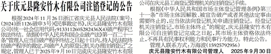 根据2024年11月26日浙江省庆元县人民法院(案号:(2024)浙1126破申3号)《民事裁定书》,庆元县隆安竹木有限公司(统一社会信用代码:9133112605282436X4)破产程序已依法终结。依据《中华人民共和国企业破产法》第一百二十一条“管理人应当自破产程序终结之日起十日内,持人民法院终结破产程序的裁定,向破产人的原登记机关办理注销登记”之规定,管理人已于2025年9月10日完成庆元县隆安竹木有限公司在庆元县工商登记管理机关的注销登记手续。