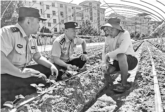 金秋时节,田野里一派丰收在望的喜人景象。东阳市公安局南市派出所扎实推进“金秋保收”警务,民警深入田间地头,宣讲防诈等安全知识,确保増收増效。图为民警走访草莓种植园,与农户一起查看莓苗长势。