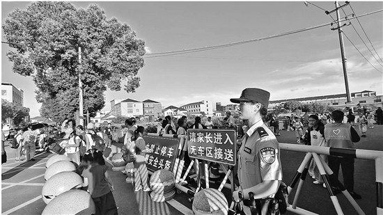 近年来,诸暨市公安局店口派出所严格落实每日护学岗工作机制,以“护学不缺位,安全无死角”为工作目标,为师生安全保驾护航。民辅警们深入每所学校摸排人流高峰时段、周边交通节点,结合校园周边情况,科学统筹警力资源,量身定制“一校一策”护学排班表。图为民警黄婧源站好暖心护学岗。 通讯员 杨晶