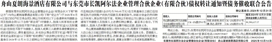 根据东莞市长凯阿尔法企业管理合伙企业(有限合伙)(下称“转让方”)与舟山夏朗海景酒店有限公司(下称“受让方”)于2025年8月8日签订的《产权交易合同》,转让方将其对以下公告清单所列借款合同及担保合同(以下合称“原合同”)对借款人、担保人所享有的主债权、担保债权(包括但不限于保证合同、质押合同项下权益)以及附属权益(包括但不限于与借款人、担保人或第三人就债务清偿事宜所达成的还款协议、债务重组协议、补充协议等合同项下权益)等项下所享有的全部权益(以下简称“标的债权”)依法转让给受让方(在交易基准日2024年12月31日之前转让方已就标的债权申请法院强制执行且相应执行回款(合计约为795.05万元)在交易基准日之前已经划转至执行法院账户的执行回款及其孳息除外,该部分资金仍然归转让方所有),原合同内容不变。现转让方和受让方以联合公告的方式通知下列借款人及担保人上述债权转让事宜。截至本公告日,下列借款人、担保人仍未履行或未完全履行相应还款、担保义务。