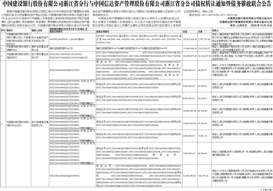 根据中国建设银行股份有限公司浙江省分行与中国信达资产管理股份有限公司浙江省分公司签署的《资产转让合同》,中国建设银行股份有限公司浙江省分行(含各分支行)已将其对下列借款人及其担保人享有的权利(包括但不限于担保债权、违约金债权、损失赔偿权、利息债权、费用债权)依法转让给中国信达资产管理股份有限公司浙江省分公司。中国建设银行股份有限公司浙江省分行与中国信达资产管理股份有限公司浙江省分公司联合公告通知各借款人及担保人以及其他相关各方。