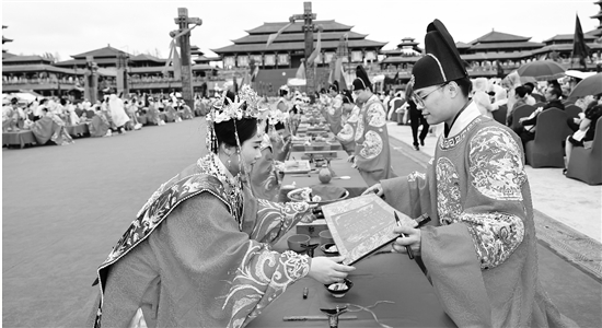 这百对新人来自各行各业,既有来自五湖四海、投身东阳建设的“新东阳人”,也有学成归来、回报桑梓的东阳“家燕”。新人行沃盥、同牢合卺、结发之礼,以婚书见证情谊,感受传统婚俗内涵。本次活动还为新人们送上了“沉甸甸”的祝福,其中一等奖为人才特价房。