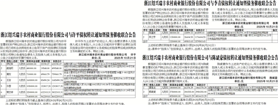根据浙江绍兴瑞丰农村商业银行股份有限公司与陈斌豪签署的《资产转让协议》,浙江绍兴瑞丰农村商业银行股份有限公司已将所合法拥有的本公告项下资产(包括债权及担保从权利)依法转让给陈斌豪,浙江绍兴瑞丰农村商业银行股份有限公司特公告通知各债务人及担保人(或义务承担人)从公告之日起向陈斌豪履行相关义务。