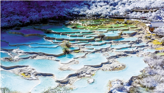 10月21日,四川省阿坝藏族羌族自治州黄龙景区迎来今秋第一场降雪,五彩池与皑皑白雪交相辉映,美不胜收。 新华社 孙家鹏 摄