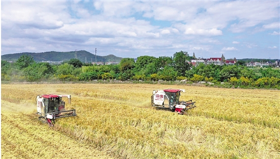 近日,在德清县乾元镇金火村由土地复垦项目建成的高标准农田里,农机手趁晴好天气驾驶收割机抢收晚稻,田间地头一派丰收景象。近年来,该镇坚持党建引领,通过“微改造 精提升”,先后将废弃矿坑、腾退虾塘以及苗木种植林改造提升为高标准农田,种植油菜、小麦、水稻等作物,促进粮食增产、农业增效、农民增收。 通讯员 倪立芳 谈梁梁