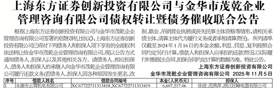 根据上海东方证券创新投资有限公司与金华市茂乾企业管理咨询有限公司签署的《债权转让协议》,上海东方证券创新投资有限公司已将对下列债务人和担保人项下享有的全部权利依法转让给金华市茂乾企业管理咨询有限公司,现以公告方式通知债务人、担保人以及其他相关各方。请债务人、相应担保人、债务人和担保人的承继人向金华市茂乾企业管理咨询有限公司履行还款义务(若债务人、担保人因各种原因发生更名、改制、歇业、吊销营业执照或丧失民事主体资格等情形,请相关承债主体、清算主体代为履行义务或者承相清算责任)。 所列清单仅截至2024年1月16日的本金余额,利息、罚息、复利按照合同约定另行计算,借款人和担保人应承担的还款责任以实际履行时根据主合同、担保合同约定计算的数额为准。特此公告。