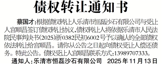 蔡国才:根据债权转让人乐清市恒磊沙石有限公司与受让人宫顺昌签订债权转让协议,债权转让人将依据乐清市人民法院民事判决书(2025)浙0382民初6002号予以确认的全部债权依法转让给宫顺昌。请你从公告之日起向债权受让人偿还债务。特此公告。债权受让人宫顺昌联系方式:13989707333。