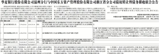 根据法律及财政部、银监会的有关规定,以及华夏银行股份有限公司温州分行与中国东方资产管理股份有限公司浙江省分公司签署的《债权转让协议》(协议编号:2025-温-保全-02,日期为2025年11月10日),华夏银行股份有限公司温州分行已将其对公告清单所列借款人及其担保人享有的主债权及借款合同、担保合同、抵债协议、还款协议和其他相关协议项下的全部权利,依法转让给中国东方资产管理股份有限公司浙江省分公司。华夏银行股份有限公司温州分行与中国东方资产管理股份有限公司浙江省分公司联合公告通知各债务人以及其他相关各方。