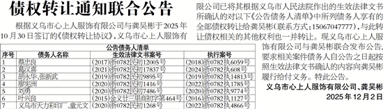 根据义乌市心上人服饰有限公司与龚吴彬于2025年10月30日签订的《债权转让协议》,义乌市心上人服饰有限公司已将其根据义乌市人民法院作出的生效法律文书所确认的对以下《公告债务人清单》中所列债务人享有的全部债权转让给龚吴彬(联系方式:15067047777),与此转让债权相关的其他权利也一并转让。现义乌市心上人服饰有限公司与龚吴彬联合发布公告,要求相关案件债务人自公告之日起按照生效法律文书确认的内容向龚吴彬履行给付义务。特此公告。