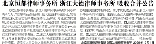 北京恒都律师事务所、浙江大德律师事务所(以下简称"两所")为了实施律所品牌战略,做大做强律师服务业,实现资源互补,加快实现律务所规模化、品牌化、专业化方向发展,经充分协商及两所全体合伙人决议同意,现就两所吸收合并及浙江大德律师事务所清算、注销事宜公告:一、由北京恒都律师事务所吸收浙江大德律师事务所合并至北京恒都(安吉)律师事务所。二、浙江大德律师事务所自2025年12月15日起停止接收新的业务并决定自该日组成清算组进行清算。请债权人自公告之日起向浙江大德律师事务所办理相关债权申报事宜。三、本次吸收合并后,浙江大德律师事务所同时注销。注销后,浙江大德律师事务所的债权、债务、业务资质、资源以及其他对外权利等,均由合并后的北京恒都(安吉)律师事务所承继。四、浙江大德律师事务所律师原有的全部文件材料(包括但不限于各种账目、账簿、案卷、档案等)均由合并后的北京恒都(安吉)律师事务所保管。五、浙江大德律师事务所的注销及吸收合并,需经原登记机关浙江省司法厅依法行政许可后生效。 特此公告!