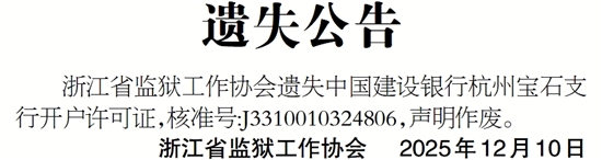 浙江省监狱工作协会遗失中国建设银行杭州宝石支行开户许可证,核准号:J3310010324806,声明作废。