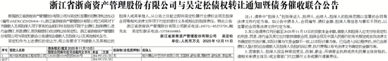 根据浙江省浙商资产管理股份有限公司与吴定松签署的《债权转让协议》(编号:03ZXCZ2025004-1),浙江省浙商资产管理股份有限公司已将其对下列借款人及其担保人项下享有的全部权利(包括但不限于主债权、担保债权、违约金债权、利息债权、损失赔偿权)依法转让给吴定松。浙江省浙商资产管理股份有限公司与吴定松联合公告通知各借款人及担保人以及其他相关各方。
