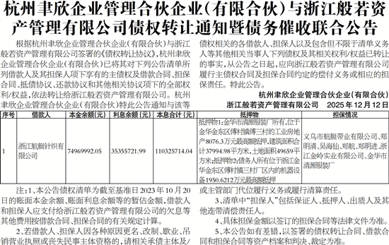 根据杭州聿欣企业管理合伙企业(有限合伙)与浙江般若资产管理有限公司签署的《债权转让协议》,杭州聿欣企业管理合伙企业(有限合伙)已将其对下列公告清单所列借款人及其担保人项下享有的主债权及借款合同、担保合同、抵债协议、还款协议和其他相关协议项下的全部权利/权益,依法转让给浙江般若资产管理有限公司。杭州聿欣企业管理合伙企业(有限合伙)特此公告通知与该等债权相关的各借款人、担保人以及包含但不限于清单义务人等其他相关当事人下列债权及其相关权利/权益已转让的事实,从公告之日起,应向浙江般若资产管理有限公司履行主债权合同及担保合同约定的偿付义务或相应的担保责任。特此公告。