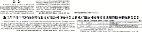 根据浙江绍兴瑞丰农村商业银行股份有限公司与杭州金民管业有限公司签署的《资产转让协议》,浙江绍兴瑞丰农村商业银行股份有限公司已将所合法拥有的本公告项下资产(包括债权及担保从权利)依法转让给杭州金民管业有限公司,浙江绍兴瑞丰农村商业银行股份有限公司特公告通知各债务人及担保人(或义务承担人),从公告之日起向杭州金民管业有限公司履行相关义务。
