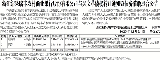 根据浙江绍兴瑞丰农村商业银行股份有限公司与吴文革签署的《资产转让协议》,浙江绍兴瑞丰农村商业银行股份有限公司已将所合法拥有的本公告项下资产(包括债权及担保从权利)依法转让给吴文革,浙江绍兴瑞丰农村商业银行股份有限公司特公告通知各债务人及担保人(或义务承担人),从公告之日起向吴文革履行相关义务。