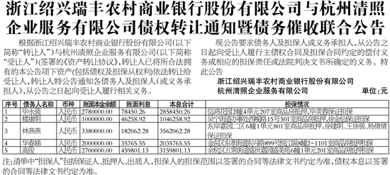 浙江绍兴瑞丰农村商业银行股份有限公司与杭州清照企业服务有限公司债权转让通知暨债务催收联合公告