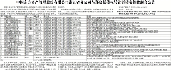根据中国东方资产管理股份有限公司浙江省分公司与郑晓儒达成的债权转让安排,中国东方资产管理股份有限公司浙江省分公司将其对公告清单所列借款人及其担保人享有的主债权及担保合同项下的全部权利,依法转让给郑晓儒。中国东方资产管理股份有限公司浙江省分公司特公告通知各借款人及担保人。