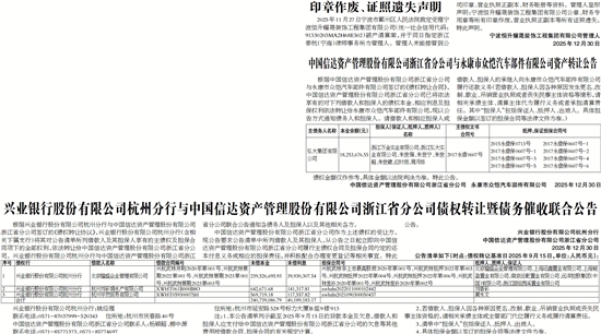 根据兴业银行股份有限公司杭州分行与中国信达资产管理股份有限公司浙江省分公司签订的《债权转让协议》,兴业银行股份有限公司杭州分行(含相关下属支行)将其对公告清单所列借款人及其担保人享有的主债权及担保合同项下的全部权利,依法转让给中国信达资产管理股份有限公司浙江省分公司。兴业银行股份有限公司杭州分行与中国信达资产管理股份有限公司浙江省分公司联合公告通知各债务人及担保人以及其他相关各方。