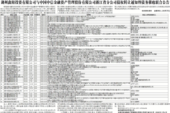 根据湖州鑫阳投资有限公司与中国中信金融资产管理股份有限公司浙江省分公司签订的《债权转让协议》(编号为浙江Y11253146-1号),湖州鑫阳投资有限公司所合法拥有的本公告项下资产(包括债权及担保从权利),已依法转让给中国中信金融资产管理股份有限公司浙江省分公司。湖州鑫阳投资有限公司特公告通知各债务人及担保人(或义务承担人),从公告之日起向中国中信金融资产管理股份有限公司浙江省分公司履行相关义务。中国中信金融资产管理股份有限公司浙江省分公司作为上述资产的受让人,现公告要求债务人及担保人(或义务承担人),从公告之日起向中国中信金融资产管理股份有限公司浙江省分公司履行借款合同及担保合同约定的偿付义务或相应的担保责任或法院判决文书所确定的义务。