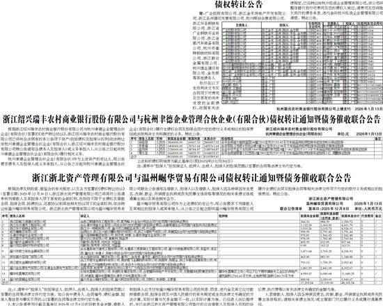 根据法律及财政部、银监会的有关规定,以及各方签署的《债权转让协议》(签署日期:2025年12月30日),浙江浙北资产管理有限公司已将其对公告清单所列借款人及其担保人项下享有的全部权利,包括但不限于主债权及借款合同、担保合同、抵债协议、还款协议和其他相关协议项下的全部权利,依法转让给温州崛华贸易有限公司。浙江浙北资产管理有限公司与温州崛华贸易有限公司联合公告通知各借款人、担保人以及借款人、担保人因各种原因发生更名、改制、歇业、吊销营业执照或丧失民事主体资格等情况的相关承债主体或清算主体以及其他相关各方。