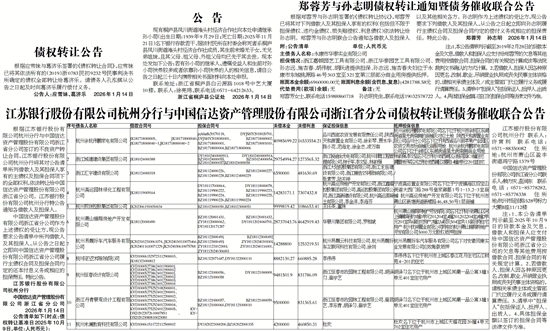 江苏银行股份有限公司杭州分行与中国信达资产管理股份有限公司浙江省分公司债权转让暨债务催收联合公告