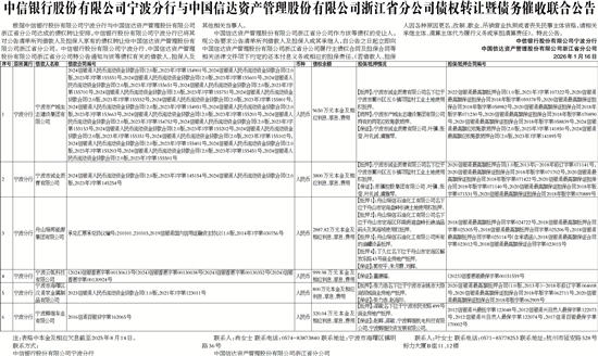 根据中信银行股份有限公司宁波分行与中国信达资产管理股份有限公司浙江省分公司达成的债权转让安排,中信银行股份有限公司宁波分行已将其对公告清单所列借款人及担保人享有的债权转让给中国信达资产管理股份有限公司浙江省分公司。中信银行股份有限公司宁波分行、中国信达资产管理股份有限公司浙江省分公司特公告通知与该等债权有关的借款人、担保人及其他相关当事人。