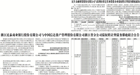 根据浙江民泰商业银行股份有限公司与中国信达资产管理股份有限公司浙江省分公司签订的《债权转让合同》,浙江民泰商业银行股份有限公司(含相关下属支行)将其对公告清单所列借款人及其担保人享有的主债权及担保合同项下的全部权利,依法转让给中国信达资产管理股份有限公司浙江省分公司。浙江民泰商业银行股份有限公司与中国信达资产管理股份有限公司浙江省分公司联合公告通知各债务人及担保人以及其他相关各方。