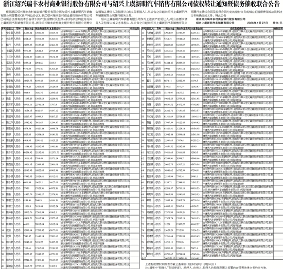 根据浙江绍兴瑞丰农村商业银行股份有限公司与绍兴上虞新明汽车销售有限公司签署的《资产转让协议》,浙江绍兴瑞丰农村商业银行股份有限公司已将所合法拥有的本公告项下资产(包括债权及担保从权利)依法转让给绍兴上虞新明汽车销售有限公司,浙江绍兴瑞丰农村商业银行股份有限公司特公告通知各债务人及担保人(或义务承担人),从公告之日起向绍兴上虞新明汽车销售有限公司履行相关义务。