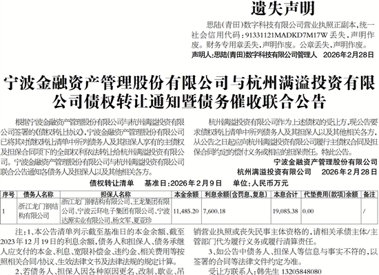 宁波金融资产管理股份有限公司与杭州满溢投资有限公司债权转让通知暨债务催收联合公告