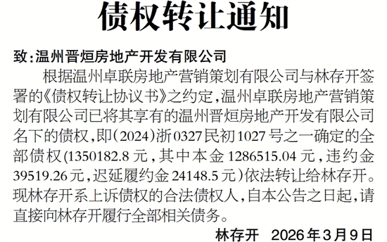 根据温州卓联房地产营销策划有限公司与林存开签署的《债权转让协议书》之约定,温州卓联房地产营销策划有限公司已将其享有的温州晋烜房地产开发有限公司名下的债权,即(2024)浙0327民初1027号之一确定的全部债权(1350182.8元,其中本金1286515.04元,违约金39519.26元,迟延履约金24148.5元)依法转让给林存开。现林存开系上诉债权的合法债权人,自本公告之日起,请直接向林存开履行全部相关债务。