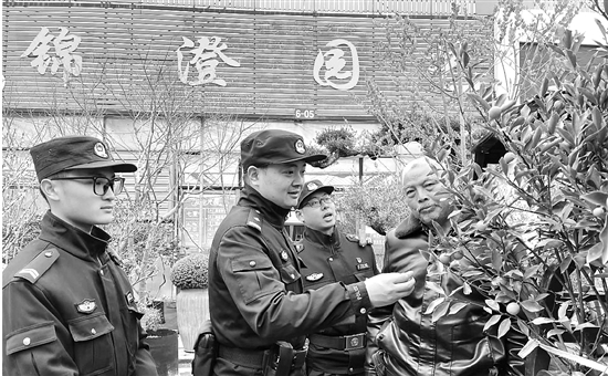 日前,金华市金东区澧浦花木城苗木市集上,苗农忙碌、客商云集。为护航苗木产业有序发展,金东公安分局澧浦派出所民警加强巡防,解答群众咨询,同步开展反诈宣传和安全防护提醒。
