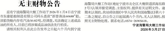 兹有宁波海警局大榭工作站于2026年1月8日在宁波市东豪船舶制造有限公司码头查获“浙普渔油60688”船,该船货舱内存有汽油50.82吨,经调查,无法确定上述成品油的所有人,目前已将涉案成品油依法先行拍卖。