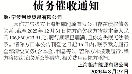 因你方与我方上海钜库能源有限公司存在债权债务关系,截至2025年12月31日你方尚欠我方货款本金人民币106,860,623.91元,履行期限已届满,且你方失联无法联系。请你方自本公告刊登之日起15日内,联系我方履行全部清偿义务(含本金、利息等)。若你方未按期履行,我方将依法采取诉讼等措施,相关费用由你方承担。
