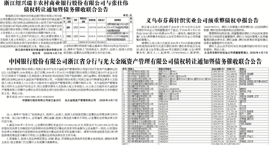 根据中国银行股份有限公司浙江省分行与光大金瓯资产管理有限公司签订的《不良资产批量转让协议》,(合同编号:2026浙批D,签订日期:2026年3月24日)中国银行股份有限公司浙江省分行(含各分支行)已将其对下列借款人及其担保人享有的权利(包括但不限于担保债权、违约金债权、损失赔偿权、利息债权)依法转让给光大金瓯资产管理有限公司。中国银行股份有限公司浙江省分行特通知各债务人及担保人(或义务承担人),从公告之日起向光大金瓯资产管理有限公司履行相关义务。光大金瓯资产管理有限公司作为上述资产的受让方,现公告要求债务人及担保人或义务承担人,从公告之日起向光大金瓯资产管理有限公司履行主债权合同及担保合同约定的偿付义务或相应的担保责任或法院判决文书所确定的义务。特此公告。