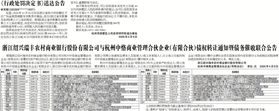 根据浙江绍兴瑞丰农村商业银行股份有限公司与杭州中恪商业管理合伙企业(有限合伙)签署的《资产转让协议》,浙江绍兴瑞丰农村商业银行股份有限公司已将所合法拥有的本公告项下资产(包括债权及担保从权利)依法转让给杭州中恪商业管理合伙企业(有限合伙),浙江绍兴瑞丰农村商业银行股份有限公司特公告通知各债务人及担保人(或义务承担人),从公告之日起向杭州中恪商业管理合伙企业(有限合伙)履行相关义务。