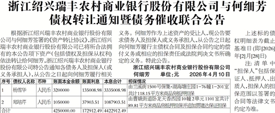 根据浙江绍兴瑞丰农村商业银行股份有限公司与何细芳签署的《资产转让协议》,浙江绍兴瑞丰农村商业银行股份有限公司已将所合法拥有的本公告项下资产(包括债权及担保从权利)依法转让给何细芳,浙江绍兴瑞丰农村商业银行股份有限公司特公告通知各债务人及担保人(或义务承担人),从公告之日起向何细芳履行相关义务。何细芳作为上述资产的受让人,现公告要求债务人及担保人或义务承担人,从公告之日起向何细芳履行主债权合同及担保合同约定的偿付义务或相应的担保责任或法院判决文书所确定的义务。特此公告。