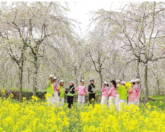 近日,浦江县公安局交通管理大队结合春季出游特点,将交通安全课堂“搬进”辖区热门赏花打卡景点。图为民辅警在大畈乡仓来村垂枝樱花培育种植基地向游客普及交通安全知识。 通讯员 杨晓东 摄