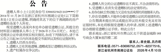 现受遗赠人汤某向本处申办接受遗赠公证,其提交的材料显示被继承人单小土于2026年2月6日死亡。本处已受理该公证申请并核实相关情况,如有下列情况的,请于本公告之日起30日内向本处提交书面异议及相应证据材料: