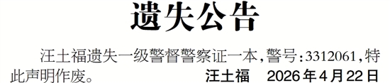 汪土福遗失一级警督警察证一本,警号:3312061,特此声明作废。 汪土福 2026年4月22日