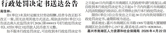 你(单位)未及时足额支付劳动报酬,经责令改正拒不改正一案,因无法用其他方式送达,现依法向你(单位)公告送达南人社监罚决字〔2026〕第000015号《行政处罚决定书》,对你(单位)处罚款人民币壹万元整。